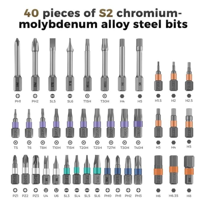 • Aluminum 42 in-1 Ratchet Torque Kit, Ratchet Screwdriver Kit. Our experienced technical team has redesigned the kit, including all the tools needed to repair furniture, including Phillips, Pentalobe, Torx, Hex, JS, Slotted, Triangle, Square, and more.