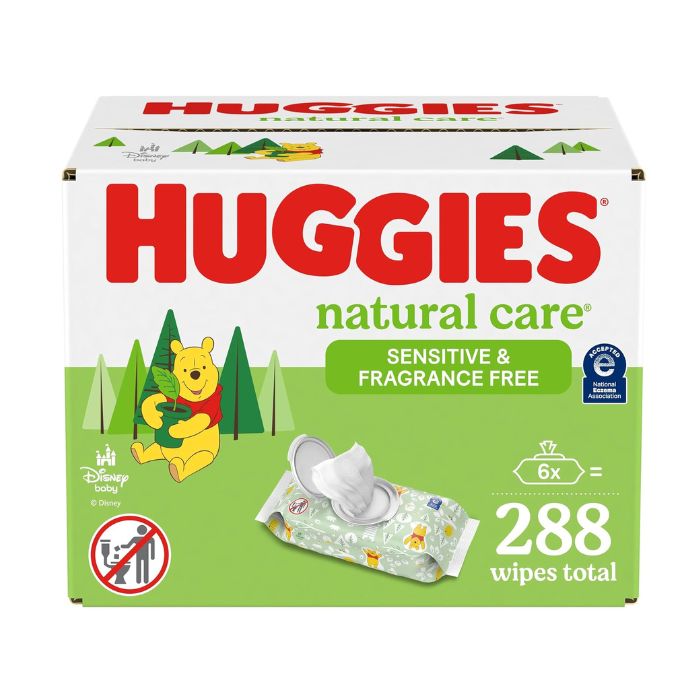 • 6 flip-top packs of 48 Huggies Natural Care Sensitive Baby Wipes, Unscented (288 wipes total).