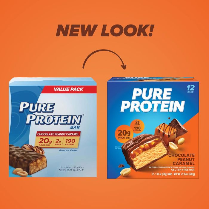 • NEW LOOK! One 12-count box of Pure Protein Chocolate Peanut Caramel Protein Bars.